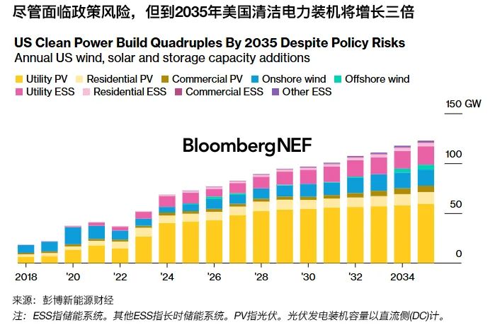 光伏是目前可用的最廉價的電力新來源。建設(shè)一座大型光伏電站僅需不到三年時間,成本僅為1.14美元/W。即使考慮新的關(guān)稅和稅收抵免風(fēng)險,彭博新能源財經(jīng)預(yù)計2025-2035年,大型地面光伏發(fā)電裝機容量將較2024年下半年展望報告中的預(yù)測增加57GW。