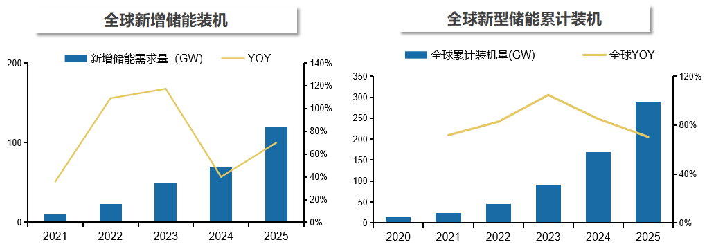 圖1 2020—2025年全球新型儲能新增裝機和累計裝機情況(2025年為預測值)