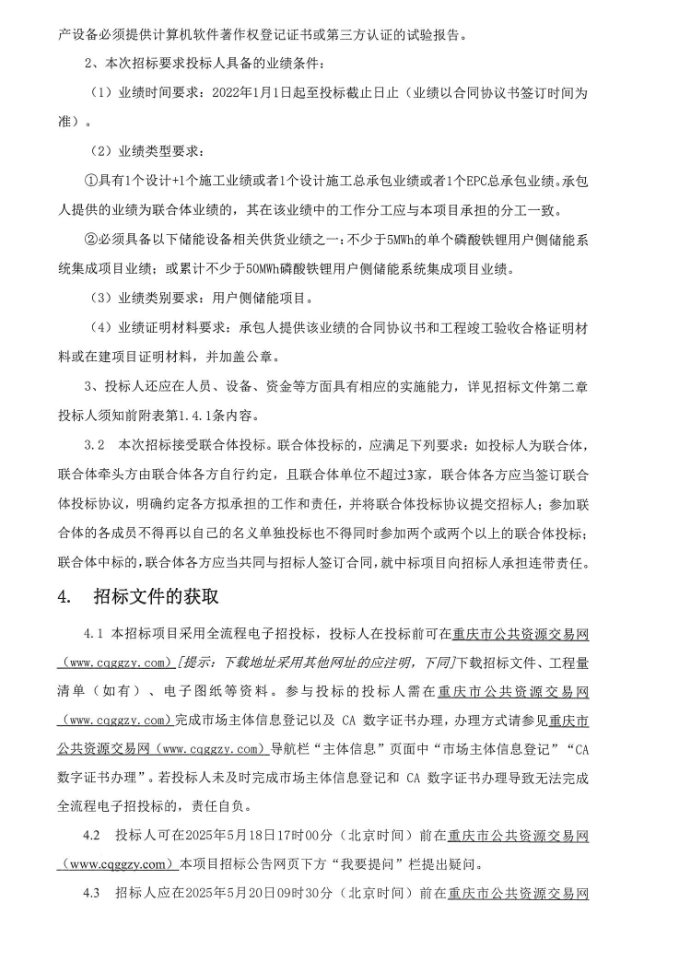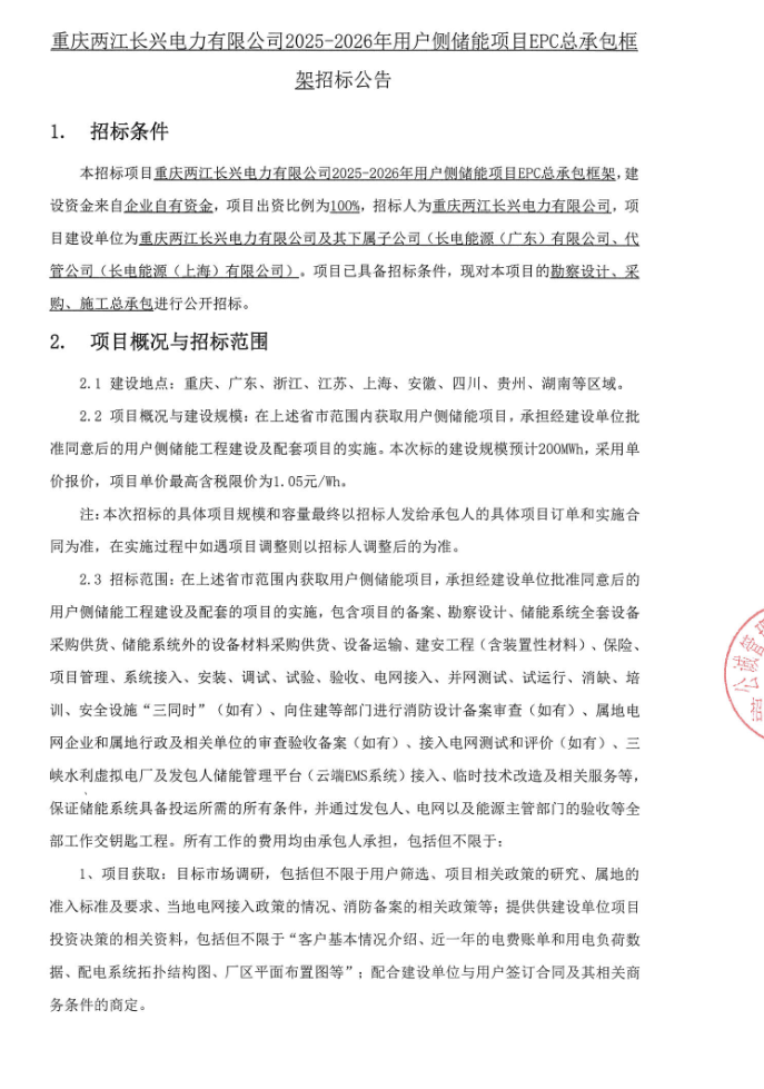 中國儲能網(wǎng)訊:5月14日,重慶兩江長興電力有限公司2025-2026年用戶側(cè)儲能項目EPC總承包框架招標(biāo)公告發(fā)布。