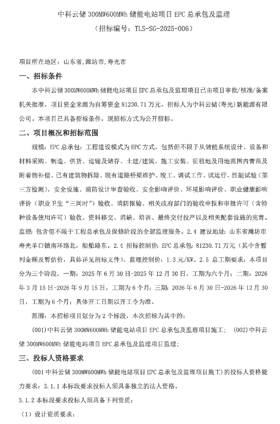 中國(guó)儲(chǔ)能網(wǎng)訊:5月17日,中科云儲(chǔ)(壽光)新能源有限公司啟動(dòng)中科云儲(chǔ)300MW600MWh儲(chǔ)能電站項(xiàng)目EPC總承包及監(jiān)理招標(biāo)。項(xiàng)目位于山東省濰坊市壽光市。