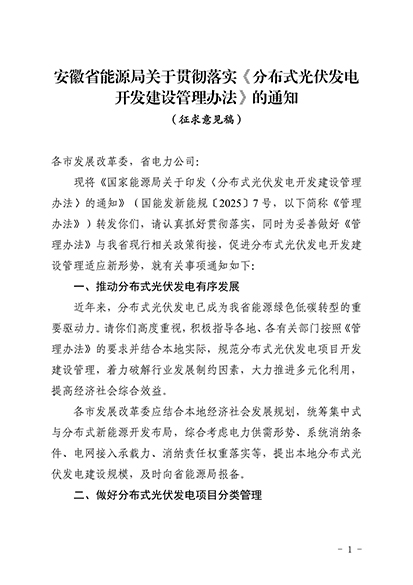 中國儲能網(wǎng)訊:5月20日,安徽省能源局發(fā)布《關于貫徹落實 (分布式光伏發(fā)電開發(fā)建設管理辦法〉的通知(征求意見稿)》。