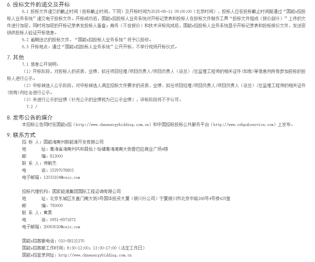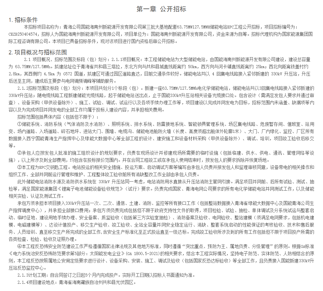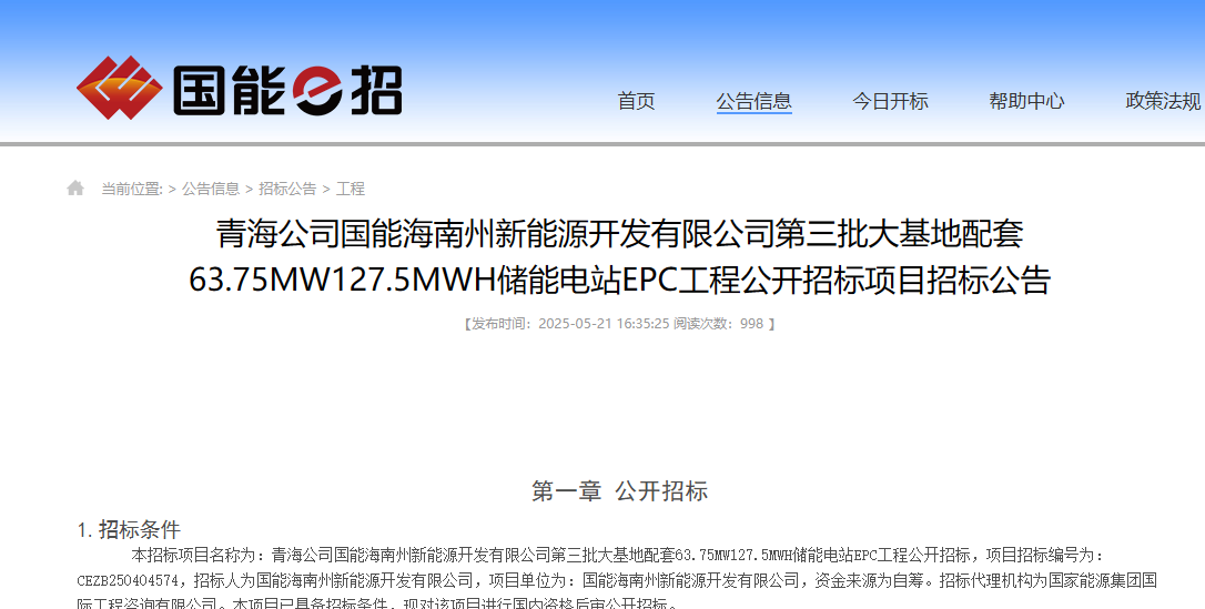 中國儲能網(wǎng)訊:5月21日,青海公司國能海南州新能源開發(fā)有限公司第三批大基地配套63.75MW127.5MWH儲能電站EPC工程公開招標(biāo)項目招標(biāo)公告發(fā)布。