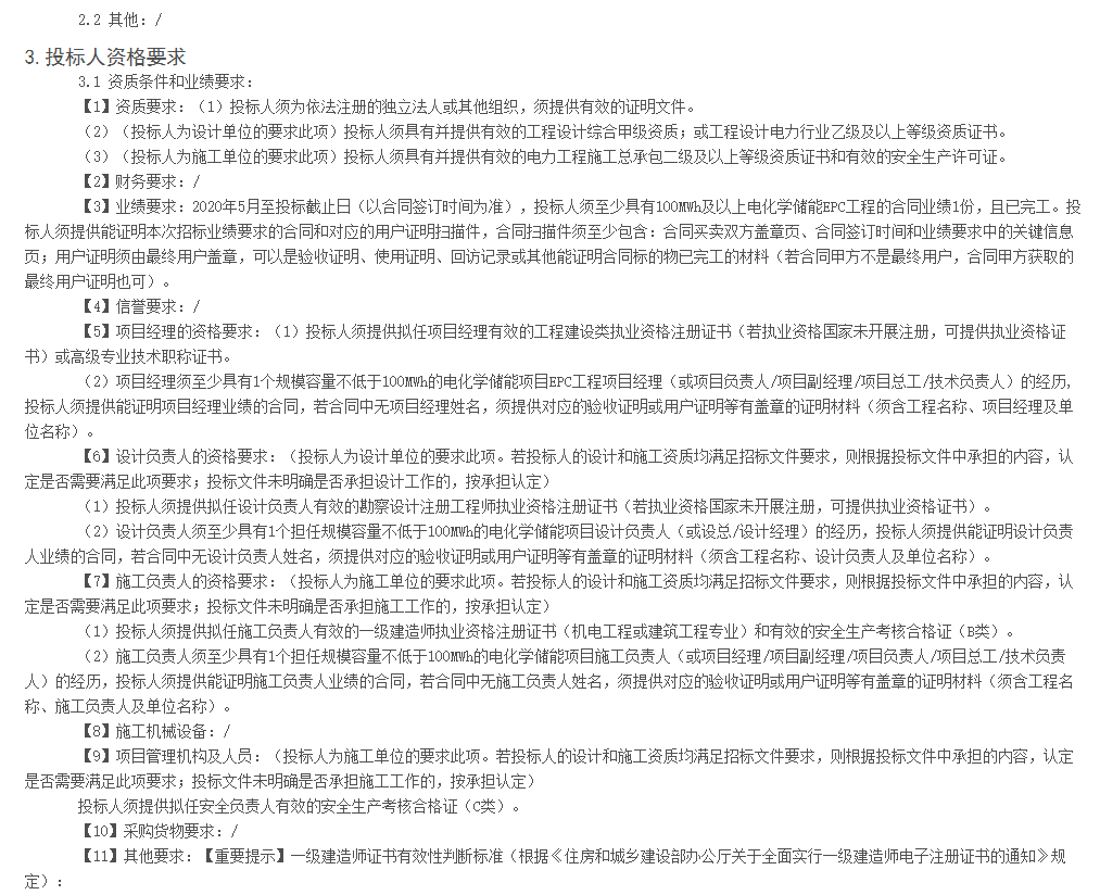 本項目共劃分1個標(biāo)段(包)。新建一座63.75MW/127.5MWh電化學(xué)儲能電站,儲能電站共以3回集電線路接入緊鄰新建的330kV升壓站;隨電纜線路工程新建儲能光纜線路,起于儲能電站送出點,止于國能330kV升壓站相關(guān)設(shè)備光纜接口處。包含設(shè)計(需滿足發(fā)包人要求并通過審查)、設(shè)備采購(甲供設(shè)備除外)、施工、試驗、調(diào)試、試運行以及各項手續(xù)辦理工作等,項目建設(shè)以完成并網(wǎng)發(fā)電為目標(biāo),招標(biāo)范圍內(nèi)未涵蓋、缺漏項等內(nèi)容以及為完成項目并網(wǎng)發(fā)電的全部工作均屬于投標(biāo)人建設(shè)內(nèi)容,并承擔(dān)相關(guān)費用。