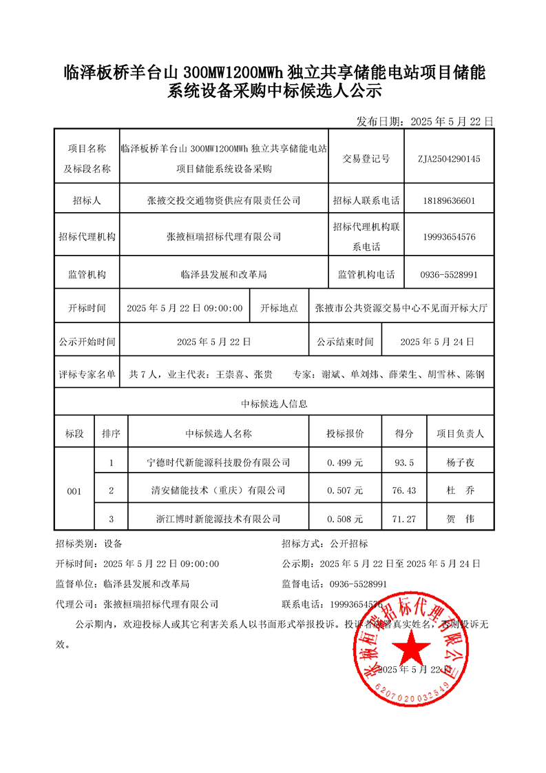 中國儲(chǔ)能網(wǎng)訊:5月22日,甘肅張掖市臨澤板橋羊臺(tái)山300MW/1200MWh獨(dú)立共享儲(chǔ)能電站項(xiàng)目儲(chǔ)能系統(tǒng)設(shè)備采購中標(biāo)候選人公示。公告顯示,寧德時(shí)代以投標(biāo)報(bào)價(jià)0.499元/Wh為第一中標(biāo)候選人預(yù)中標(biāo)。