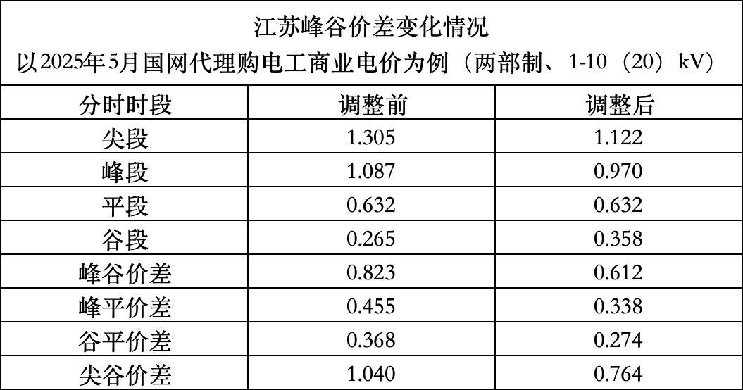 以2025年5月江蘇省1-10(20)kV代理購電工商業(yè)用戶電價為例,新政實施后,峰谷價差從調(diào)整前的0.8225元/kWh降至0.6122元/kWh,降幅高達25.57%。