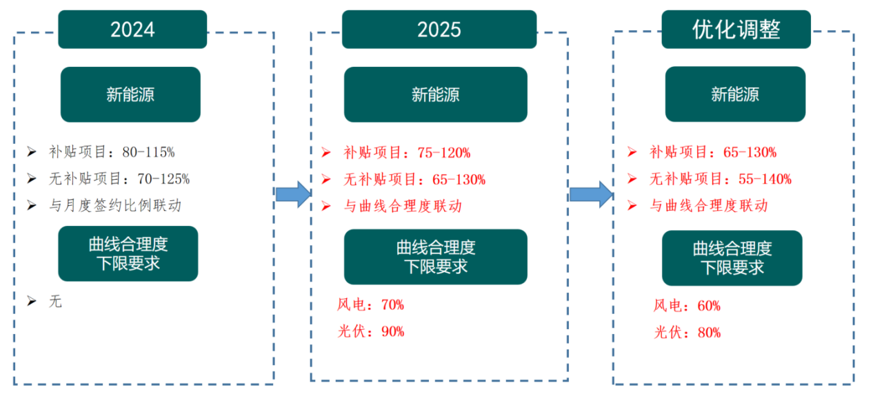 新能源電站策略主要分為依靠風(fēng)險(xiǎn)防范補(bǔ)償來(lái)兜底和根據(jù)現(xiàn)貨和中長(zhǎng)期價(jià)差來(lái)積極調(diào)倉(cāng)兩種。對(duì)于依賴風(fēng)險(xiǎn)防范補(bǔ)償?shù)膱?chǎng)站而言,2025年風(fēng)險(xiǎn)防范補(bǔ)償系數(shù)第一次下降5%,4月份繼續(xù)下降10%,同時(shí)與曲線合理度掛鉤,1-3月風(fēng)電企業(yè)的月度曲線合理度要求達(dá)到70%,光伏企業(yè)的月度曲線合理度要求達(dá)到90%(實(shí)際測(cè)算兩者都很難達(dá)到);在2025年4月優(yōu)化調(diào)整后的規(guī)則版本中,風(fēng)電企業(yè)的月度曲線合理度要求達(dá)到60%,光伏企業(yè)的月度曲線合理度要求達(dá)到80%(達(dá)標(biāo)仍困難),風(fēng)險(xiǎn)防范比例的上下限將根據(jù)合理度的下降程度的50%做相應(yīng)的調(diào)整,以補(bǔ)貼風(fēng)電為例,風(fēng)險(xiǎn)防范的補(bǔ)償系數(shù)將在0.75的基礎(chǔ)上繼續(xù)下降,最低將下降至0.4。該項(xiàng)約束將在2025年嚴(yán)重影響依靠吃補(bǔ)償?shù)男履茉错?xiàng)目的收益。