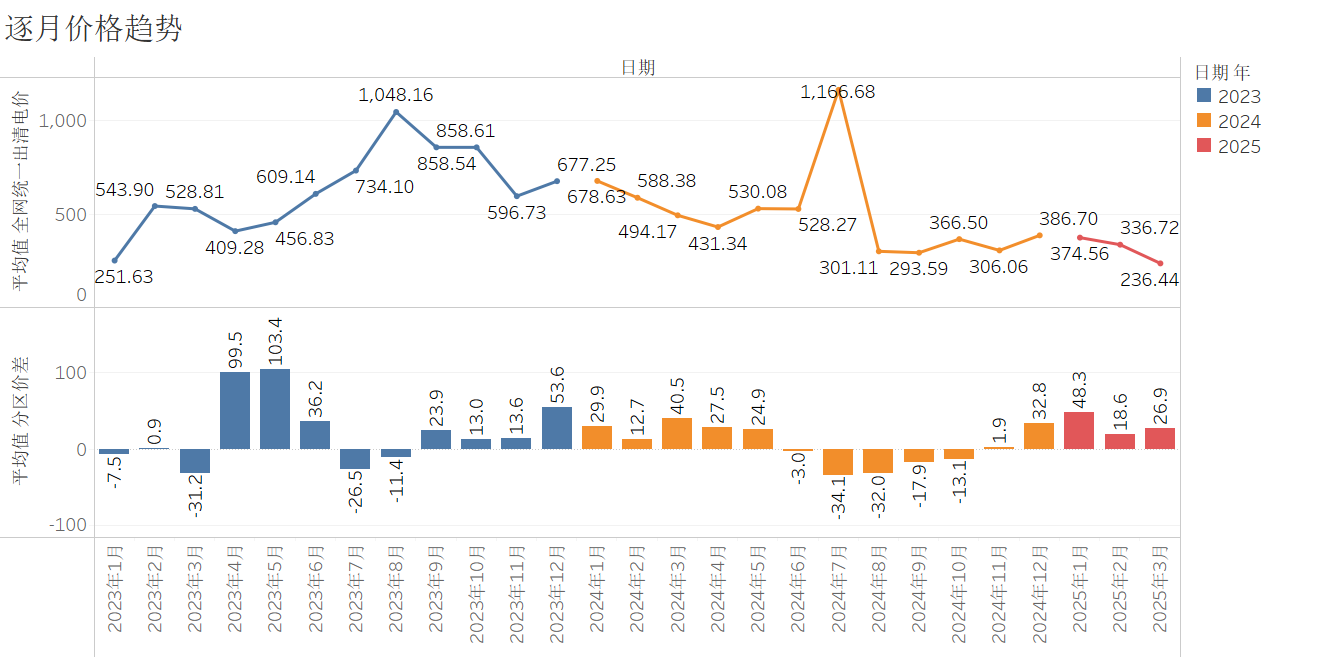 2025年以來(lái),1-3月全網(wǎng)統(tǒng)一出清電價(jià)分別為374.56元/兆瓦時(shí)、336.72元/兆瓦時(shí)、236.44元/兆瓦時(shí),1-3月平均價(jià)格為315.91元/兆瓦時(shí),相比2024年全年平均價(jià)格505.96元/兆瓦時(shí)下降38%,該明顯下降的趨勢(shì)背后主要系供需不平衡所致。