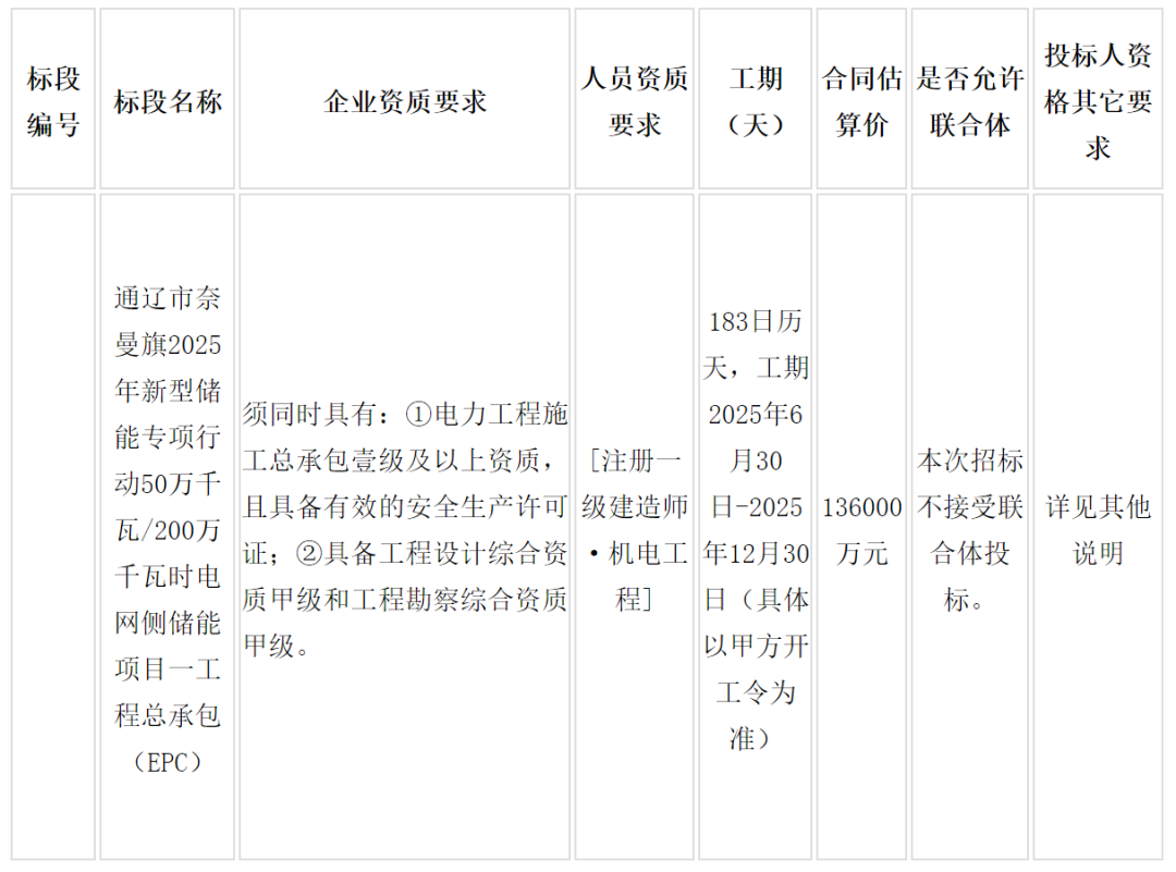 一、招標(biāo)條件本招標(biāo)項目通遼市奈曼旗2025年新型儲能專項行動50萬千瓦/200萬千瓦時電網(wǎng)側(cè)儲能項目一工程總承包(EPC)已經(jīng)由通遼市能源局以 2505-150525-60-01-113232 號文件批準(zhǔn)建設(shè),招標(biāo)人為通遼海螺新能源有限公司,建設(shè)資金來自國有(非財政)資金65%,民營資金35%,項目出資按比例為自籌136000.00萬元。項目已具備招標(biāo)條件,現(xiàn)對該項目進行公開招標(biāo)。