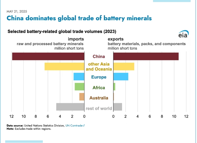 中國(guó)儲(chǔ)能網(wǎng)訊:美國(guó)能源信息署發(fā)表文章:中國(guó)在全球電池供應(yīng)鏈的每個(gè)環(huán)節(jié)都發(fā)揮著重要作用,并且主導(dǎo)著礦物的區(qū)域間貿(mào)易。