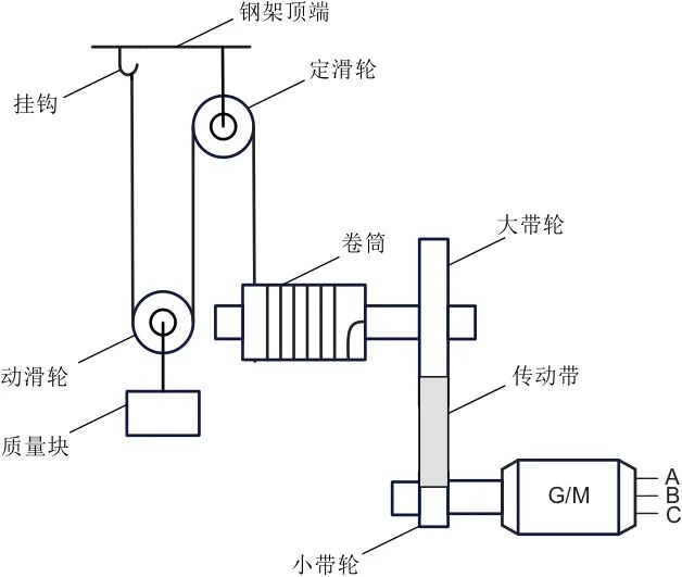 系統(tǒng)主要由質(zhì)量塊、發(fā)電/電動機、傳動裝置、曳引裝置和鋼架五大部分組成,其中傳動裝置由大帶輪、傳動帶和小帶輪組成,曳引裝置則由卷筒和鋼絲繩組成。質(zhì)量塊是重力勢能的儲存單元,發(fā)電/電動機是系統(tǒng)進(jìn)行機電能量轉(zhuǎn)換的核心,而傳動裝置用于在高轉(zhuǎn)速、小轉(zhuǎn)矩的電機側(cè)與低轉(zhuǎn)速、大轉(zhuǎn)矩的機械側(cè)之間建立聯(lián)系,曳引裝置用于執(zhí)行質(zhì)量塊的升降,鋼架的高度則決定了質(zhì)量塊升降的最大高度差。
