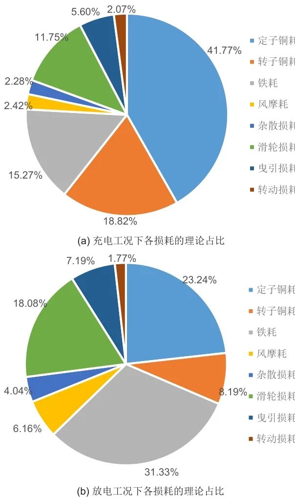 由圖2可知,放電工況下機械損耗占比與充電工況相比明顯升高,且滑輪損耗在機械損耗中主導(dǎo)地位,而傳動損t耗僅占極小部分。