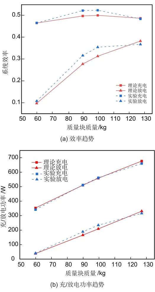根據(jù)實驗數(shù)據(jù)對計算不同質(zhì)量塊質(zhì)量下的系統(tǒng)充/放電效率及功率,與理論結(jié)果比較,如圖4所示。