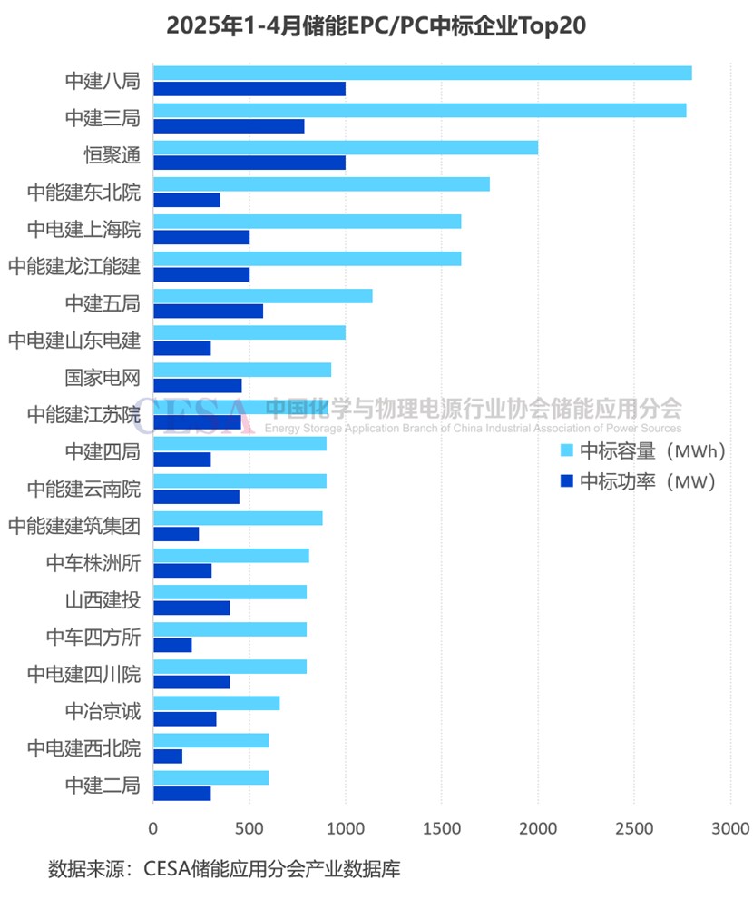就儲能EPC/PC中標企業(yè)分析,2025年1-4月,中能建、中建、中電建三大集團中標規(guī)模高達8.87GW/23.96GWh,占全國儲能EPC/PC(含設(shè)備)采招落地總規(guī)模的58.75%。