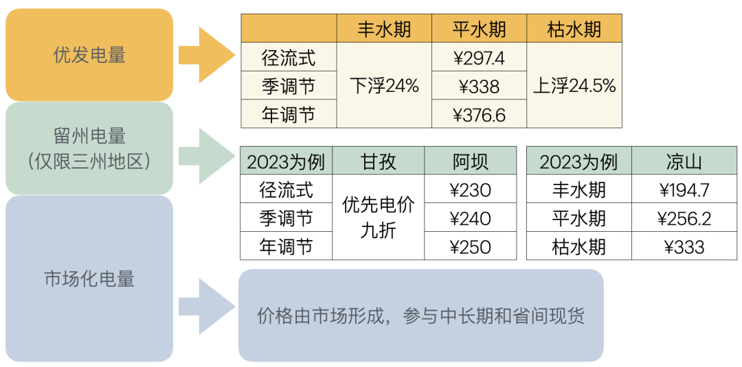 此外,由于成都平原與川西高原經(jīng)濟(jì)發(fā)展不均衡,根據(jù)「國(guó)家發(fā)改委關(guān)于四川省藏區(qū)留存電量和電價(jià)管理辦法的批復(fù)」與「四川省三州留存電量分配原則」兩個(gè)文件,三州地區(qū)(甘孜,阿壩,涼山)水電站定量定價(jià)均攤留存電量,以2023年甘孜州為例,共計(jì)50個(gè)水電站均攤26.6億的留州電量,這部分電量非常特殊,既不屬于「市場(chǎng)化電量」,也不屬于「優(yōu)先電量」,屬于特殊的「留州電量」,優(yōu)先級(jí)僅次于優(yōu)先電量。