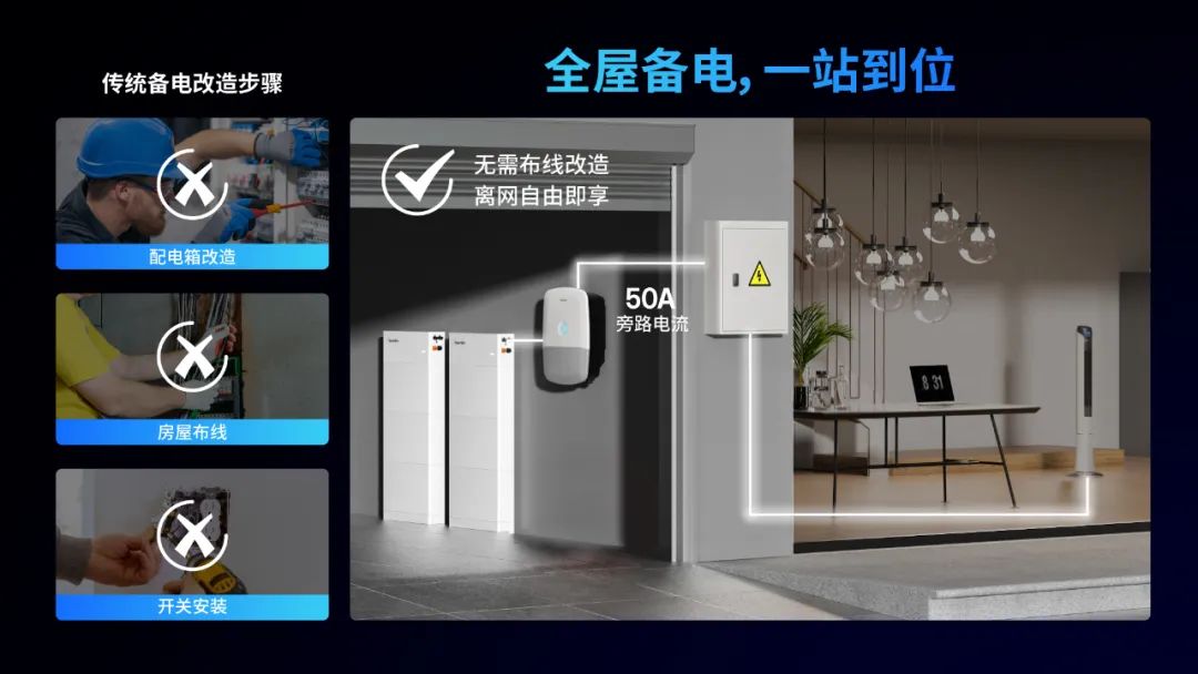 全EPS(應(yīng)急電源)支持全屋備用電源,具備50A旁路電流,為當前及未來的用電需求提供充分保障。系統(tǒng)無需重新布線或電路升級,即可實現(xiàn)無縫接入。同時,HIT系列采用小巧靈活的新型電表,插拔式接入配電箱,顯著簡化安裝流程,節(jié)省施工時間。