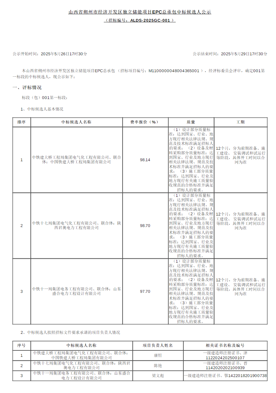 中國儲能網(wǎng)訊:5月26日,山西省朔州市經(jīng)濟(jì)開發(fā)區(qū)獨立儲能項目EPC總承包中標(biāo)候選人公示。