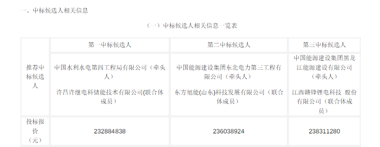 該項目建設(shè)規(guī)模為100MW/400MWh,最后共有6家企業(yè)以聯(lián)合體形式入圍,包括許繼電科、東方旭能、贛鋒鋰電等企業(yè),其中中國水利水電第四工程局有限公司、許昌許繼電科儲能技術(shù)有限公司以單價0.582元/Wh成為第一中標(biāo)候選人。