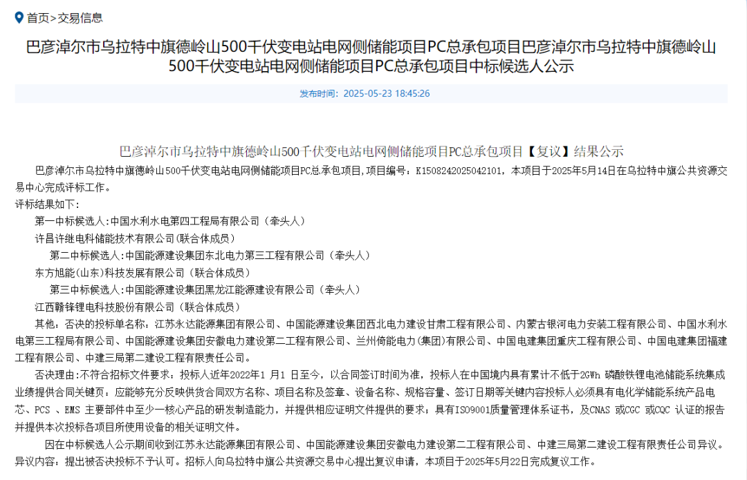5月23日,烏拉特中旗公共資源交易中心公布該項目復(fù)議結(jié)果,其中顯示: