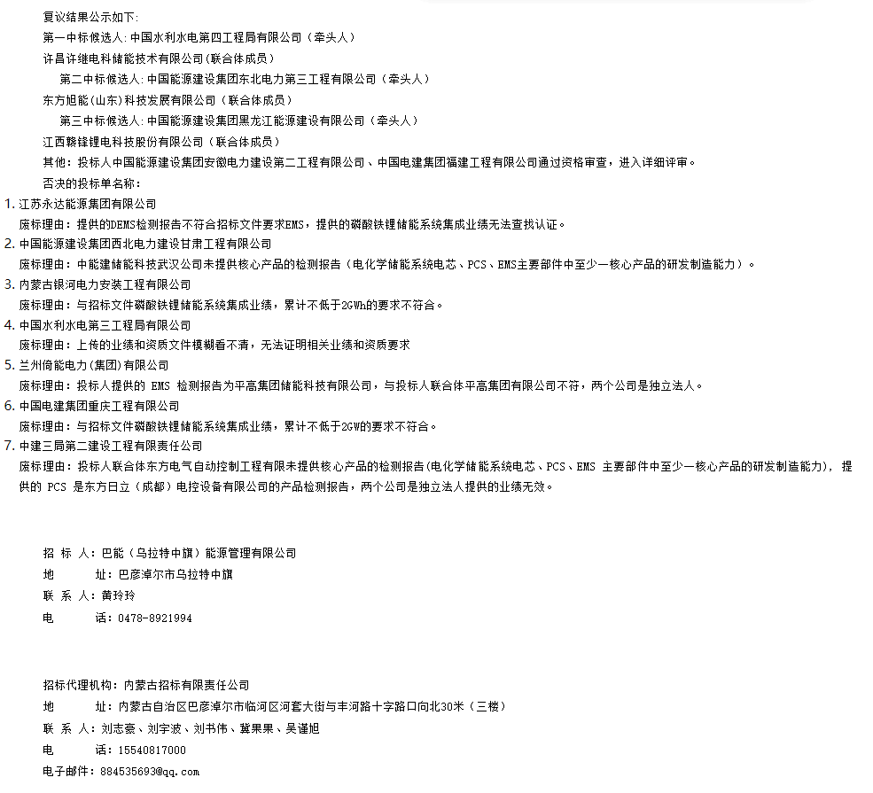江蘇永達能源集團有限公司因“提供的DEMS檢測報告不符合招標(biāo)文件要求EMS,提供的磷酸鐵鋰儲能系統(tǒng)集成業(yè)績無法查找認(rèn)證”而被廢標(biāo);中國能源建設(shè)集團西北電力建設(shè)甘肅工程有限公司、中建三局第二建設(shè)工程有限責(zé)任公司因投標(biāo)聯(lián)合體“未提供核心產(chǎn)品的檢測報告”而被廢標(biāo);內(nèi)蒙古銀河電力安裝工程有限公司、中國電建集團重慶工程有限公司均因為“不符合磷酸鐵鋰儲能系統(tǒng)集成業(yè)績累計不低于2GW的要求”而廢標(biāo);中國水利水電第三工程局有限公司則因為“上傳的業(yè)績和資質(zhì)文件模糊看不清,無法證明相關(guān)業(yè)績和資質(zhì)要求”而廢標(biāo)。