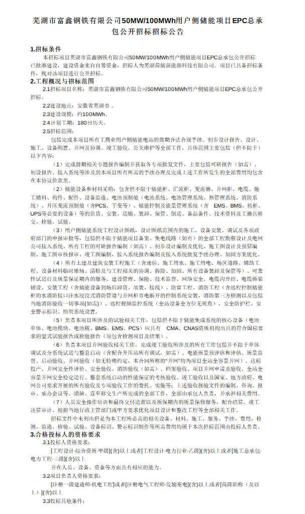 中國儲能網(wǎng)訊:5月27日,蕪湖市富鑫鋼鐵有限公司50MW/100MWh用戶側(cè)儲能項目EPC總承包公開招標(biāo)招標(biāo)公告發(fā)布。
