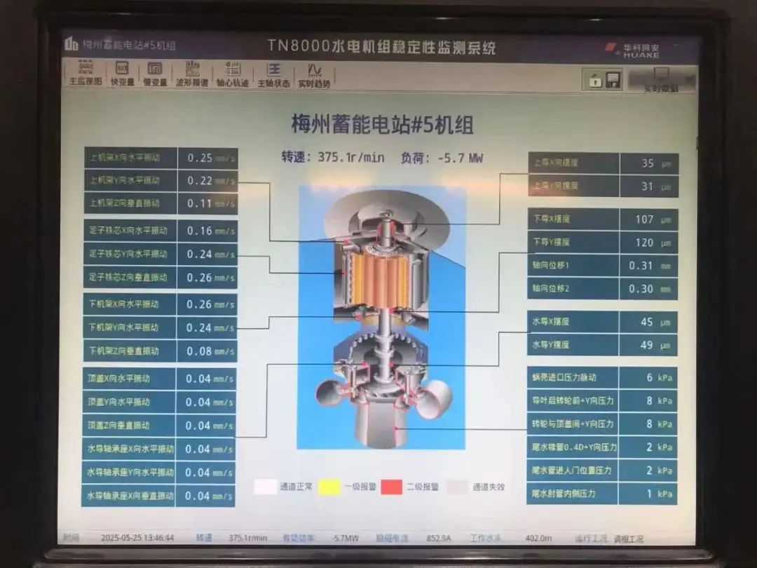 5號(hào)機(jī)組于5月25日13點(diǎn)31分完成抽水調(diào)相并網(wǎng)試驗(yàn),試驗(yàn)過(guò)程中壓水時(shí)間、氣罐壓力、機(jī)組振擺、瓦溫,噪音等穩(wěn)定指標(biāo)全部滿足要求,機(jī)組運(yùn)行平順、各輔助設(shè)備運(yùn)行穩(wěn)定。