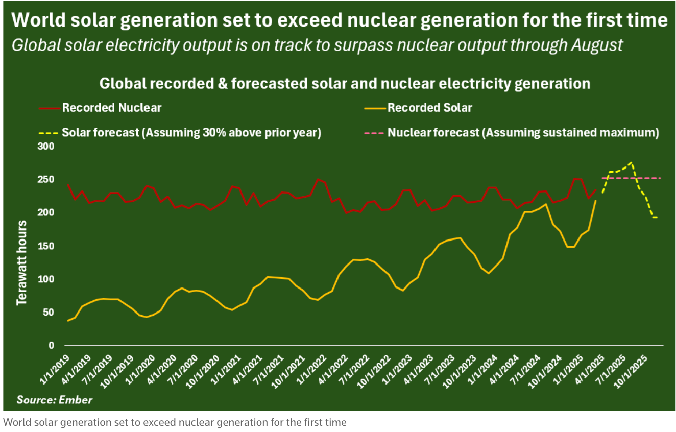 從總體裝機來看,2024年太陽能的總裝機在所有主要發(fā)電來源中排名第三,僅次于煤炭的2174吉瓦和天然氣的2055吉瓦,但超過了水電的1283吉瓦和風能的1132吉瓦。不斷增長的太陽能裝機推動了每年太陽能發(fā)電峰值達到歷史新高。Ember數(shù)據(jù)顯示,自2020年以來,公用事業(yè)規(guī)模太陽能發(fā)電量每年平均增長25%。但在2025年的前三個月,太陽能發(fā)電量比2024年同期增長了34%,這得益于幾個關鍵地區(qū)發(fā)電能力的廣泛增長。如果月度太陽能發(fā)電量繼續(xù)比2024年同期增長約30%,那么今年6月、7月和8月,全球太陽能發(fā)電量每月應超過260太瓦時(TWh)。這些發(fā)電量很可能輕松超過全球核電站的月度發(fā)電量,自2019年以來,其月度發(fā)電量峰值略低于252太瓦時,2024年平均每月發(fā)電量為223太瓦時。從9月開始,隨著北半球(全球超過四分之三的太陽能發(fā)電廠位于北半球)的日照時間開始減少,太陽能發(fā)電量可能會回落至250太瓦時以下。