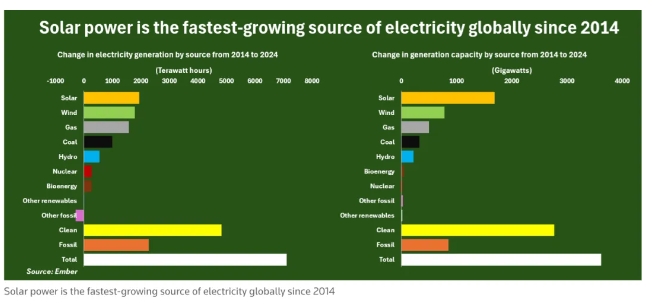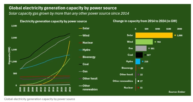在過去十年中,公用事業(yè)公司在發(fā)電網(wǎng)絡中增加了兩倍多的太陽能發(fā)電能力,超過了其他任何電力來源,這主要得益于太陽能系統(tǒng)的相對低成本和快速連接時間。根據(jù)能源智庫Ember的數(shù)據(jù),截至2024年全球電力系統(tǒng)共有1866吉瓦(GW)的公用事業(yè)規(guī)模太陽能發(fā)電能力。該裝機規(guī)模是2014年產(chǎn)能的10倍,在此期間,在所有主要電力來源中,太陽能發(fā)電能力的增長遠遠超過了其他任何主要電力來源。 在過去的十年中,風能發(fā)電的產(chǎn)能增長位居第二,增長了3.2倍,而所有其他發(fā)電來源的裝機容量增長均未超過兩倍。
