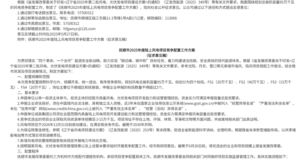 中國儲能網(wǎng)訊:近日,遼寧撫順市發(fā)展和改革委員會發(fā)布關(guān)于《撫順市2025年度陸上風電項目競爭配置工作方案(征求意見稿)》 公開征集意見的通知。規(guī)劃總裝機容量95萬千瓦的風電競爭配置工作。