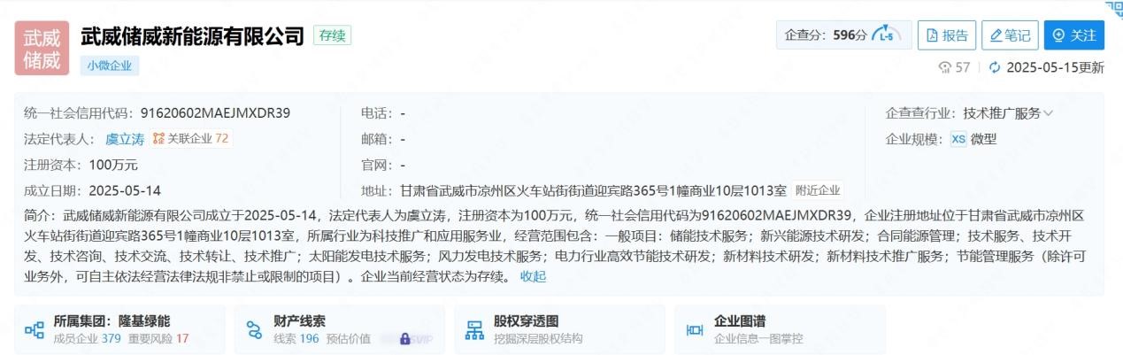 中國儲能網(wǎng)訊:當(dāng)隆基綠能全資子公司武威儲威新能源有限公司的工商信息在企查查上悄然更新,一場由光伏龍頭掀起的儲能產(chǎn)業(yè)革命已進(jìn)入白熱化階段。這家以光伏組件稱霸全球的企業(yè),正將觸角伸向儲能服務(wù)、新興能源技術(shù)研發(fā)等核心領(lǐng)域,標(biāo)志著中國光伏軍團(tuán)正式吹響向儲能賽道全面進(jìn)攻的號角。