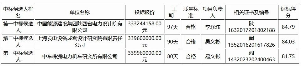 第一中標候選人:中國能源建設集團陜西省電力設計院有限公司,投標報價33324.4158萬元,折合單價0.555元/Wh;
