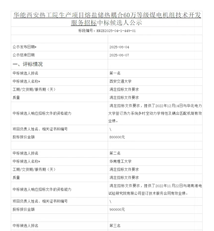 中國儲能網(wǎng)訊:6月4日,華能西安熱工院生產(chǎn)項目熔鹽儲熱耦合60萬等級煤電機組技術(shù)開發(fā)服務(wù)招標(biāo)項目發(fā)布中標(biāo)候選人公示,候選人第一名為西安交通大學(xué),投標(biāo)報價金額為800000元。