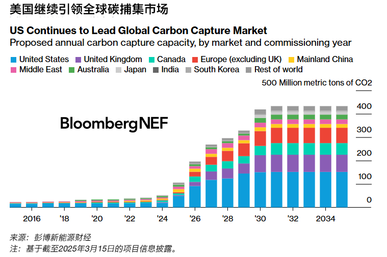 彭博新能源財(cái)經(jīng)的基準(zhǔn)情景預(yù)測(cè),到2035年,美國將有9,800萬噸/年的新增碳捕集能力投運(yùn),繼續(xù)保持市場(chǎng)份額第一,但政治因素給投資前景蒙上陰影,阻礙了新增捕集能力的宣布。與此同時(shí),英國和歐洲大陸的市場(chǎng)份額卻在上升。英國的Track-1項(xiàng)目已作出最終投資決定,而殼牌和Equinor等公司牽頭的歐盟基礎(chǔ)設(shè)施樞紐項(xiàng)目正在穩(wěn)步推進(jìn)。