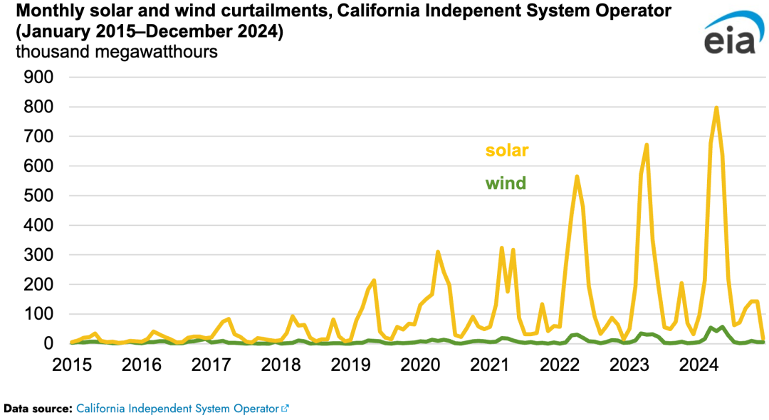 中國(guó)儲(chǔ)能網(wǎng)訊:據(jù)美國(guó)能源信息署 (EIA)的數(shù)據(jù),加州獨(dú)立系統(tǒng)運(yùn)營(yíng)商(CAISO,負(fù)責(zé)加州大部分地區(qū)的電網(wǎng)運(yùn)營(yíng))在平衡供需的同時(shí),隨著可再生能源裝機(jī)容量的快速增長(zhǎng),越來越多地削減太陽(yáng)能和風(fēng)能發(fā)電。