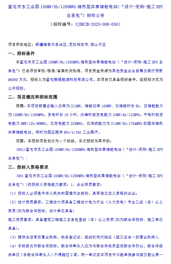中國儲能網(wǎng)訊:6月7日,奎屯鵬煜能源科技有限公司發(fā)布了奎屯市東工業(yè)園150MW/8h/1200MWh儲熱型共享儲能電站(“設計-采購-施工EPC總承包”)招標公告。