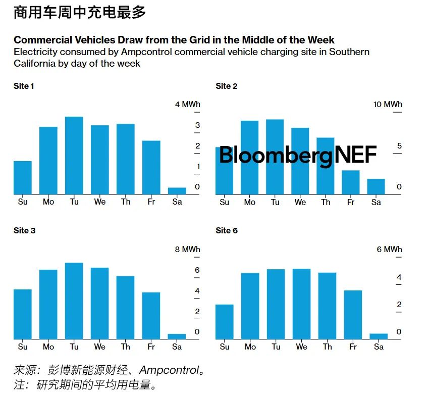 本研究中的六個充電站在六個月內(nèi)用電3.4GWh,約相當于680個美國家庭同期的用電量。最高峰時,最大充電站的用電量達到13.4MWh,約相當于23棟寫字樓的日用電量。