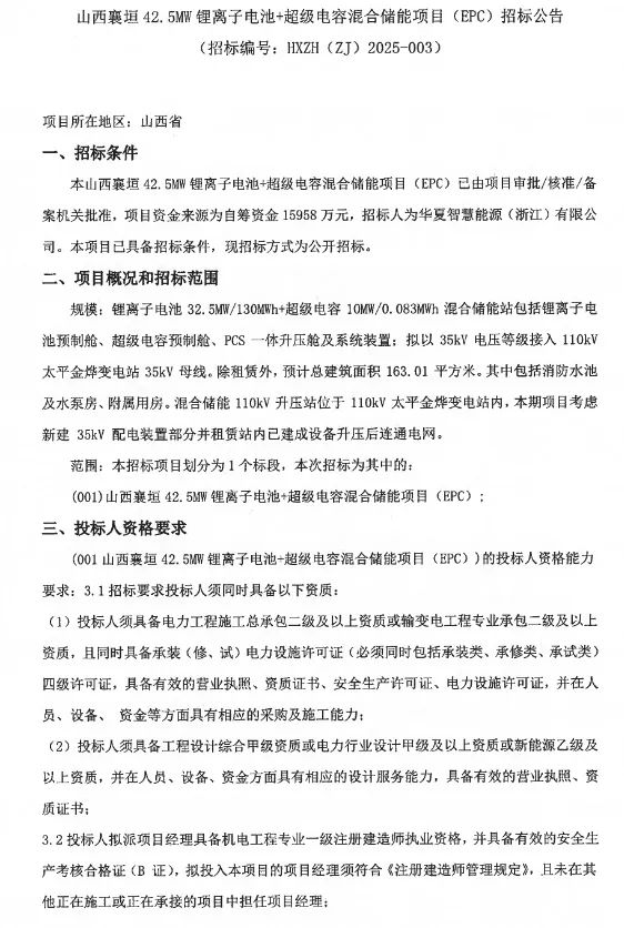 中國儲能網(wǎng)訊:2025年6月9日,華夏智慧能源(浙江)有限公司發(fā)布了山西襄垣42.5MW鋰離子電池+超級電容混合儲能項(xiàng)目EPC招標(biāo)公告,合計(jì)規(guī)模42.5MW/130MWh,項(xiàng)目資金來源為自籌資金15958萬元,約合1.228元/Wh。