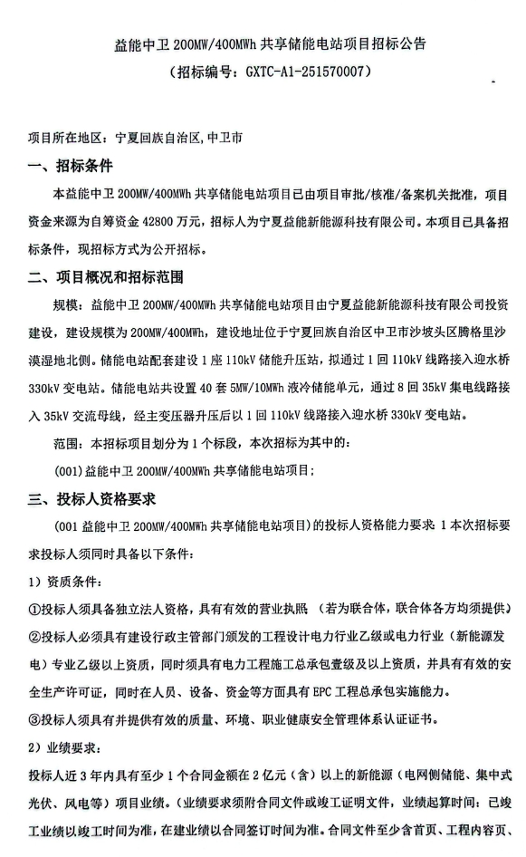 要求投標(biāo)人近3年內(nèi)具有至少1個合同金額在2億元(含)以上的新能源(電網(wǎng)側(cè)儲能、集中式光伏、風(fēng)電等)項目業(yè)績。