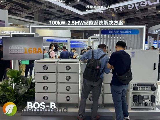 德業(yè)展出了多款新品,包含戶用光儲、工商業(yè)光儲、陽臺(微型)光儲、光儲充一體化等領域,其中100kW-2.5MW模塊化工業(yè)級解決方案,由500kW STS搭配多臺100kW/125kW PCS模塊,匹配BOS-B系列215kWh儲能電池,還可以選配200kWp光伏模塊,實現對2.5MW以下工商業(yè)儲能系統功率、電池容量、光伏裝機量的靈活適應。
