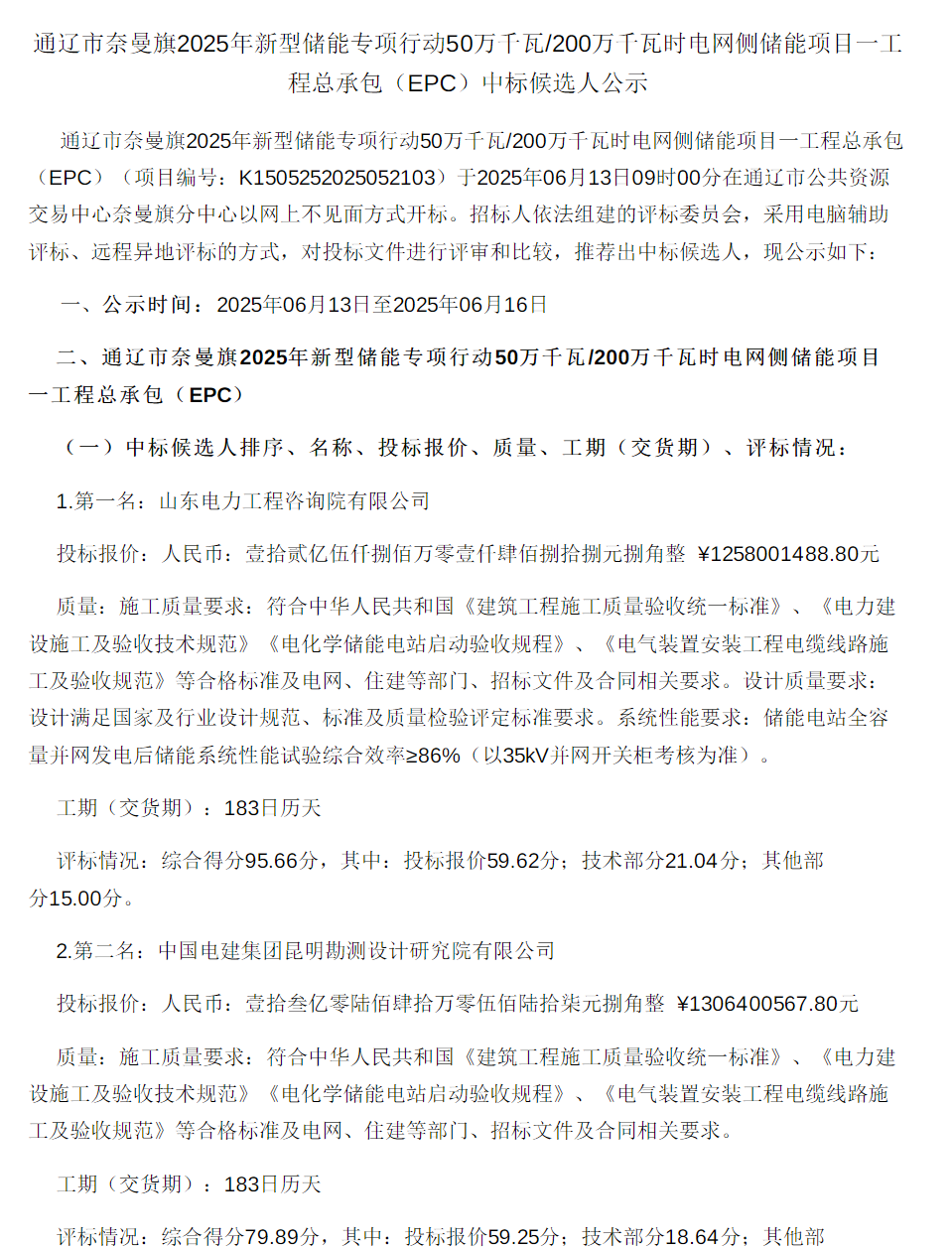 中國(guó)儲(chǔ)能網(wǎng)訊:6月14日,通遼市奈曼旗2025年新型儲(chǔ)能專項(xiàng)行動(dòng)50萬千瓦/200萬千瓦時(shí)電網(wǎng)側(cè)儲(chǔ)能項(xiàng)目一工程總承包(EPC)項(xiàng)目中標(biāo)候選人公示。