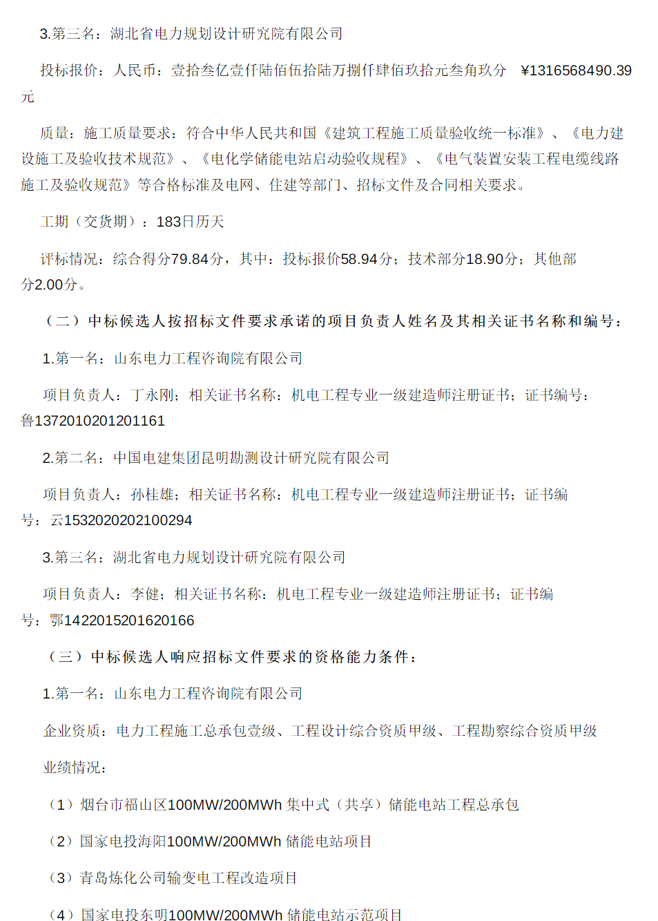第三中標(biāo)候選人為湖北省電力規(guī)劃設(shè)計(jì)研究院有限公司,投標(biāo)報(bào)價(jià)為1316568490.39元,折合單價(jià)為0.6583元/Wh,綜合得分79.84分。