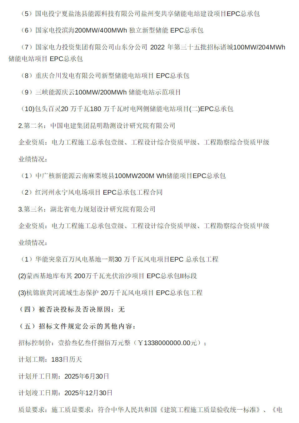 第二中標(biāo)候選人為中國(guó)電建集團(tuán)昆明勘測(cè)設(shè)計(jì)研究院有限公司,投標(biāo)報(bào)價(jià)為1306400567.8元,折合單價(jià)為0.6532元/Wh,綜合得分79.89分。