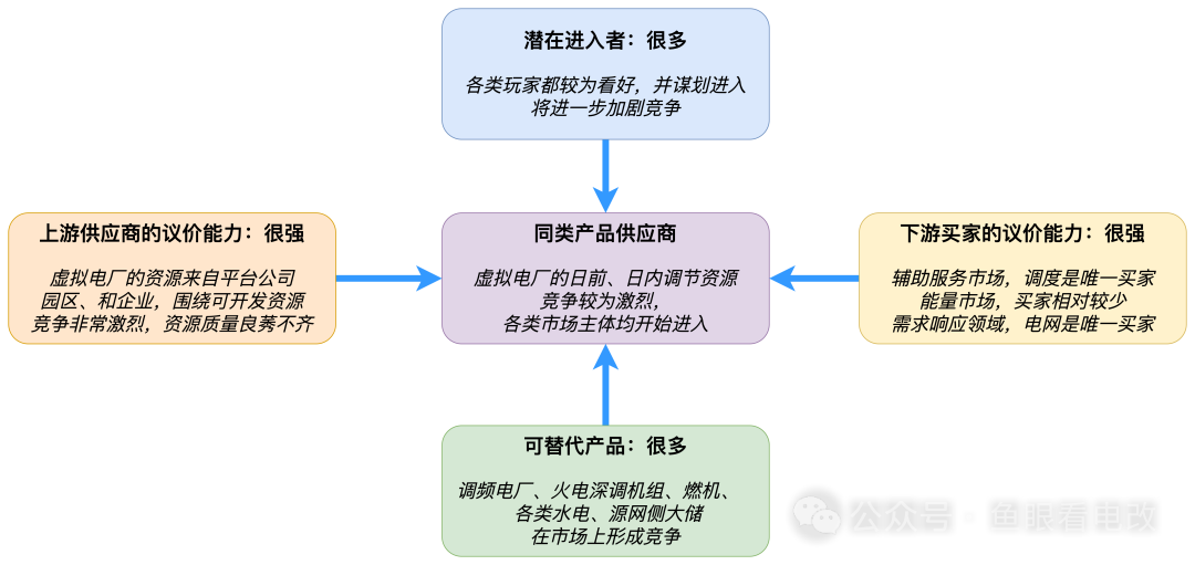 從下游來說,輔助服務(wù)市場(chǎng)目前主要的買家是電力調(diào)度部門,尤其是省級(jí)調(diào)度,具備很強(qiáng)的唯一性,買家對(duì)虛擬電廠的議價(jià)能力也很強(qiáng)。需求響應(yīng)的買家是政府(補(bǔ)貼模式),也是唯一的。能量市場(chǎng)的購買者,真正有購買意愿的售電公司的數(shù)量也不多。