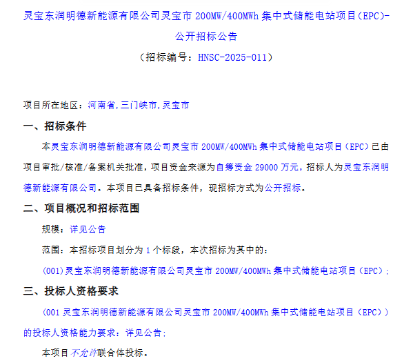 中國儲能網(wǎng)訊:6月17日,靈寶東潤明德新能源有限公司發(fā)布河南三門峽靈寶市200MW/400MWh集中式儲能電站項目(EPC)招標(biāo)公告。