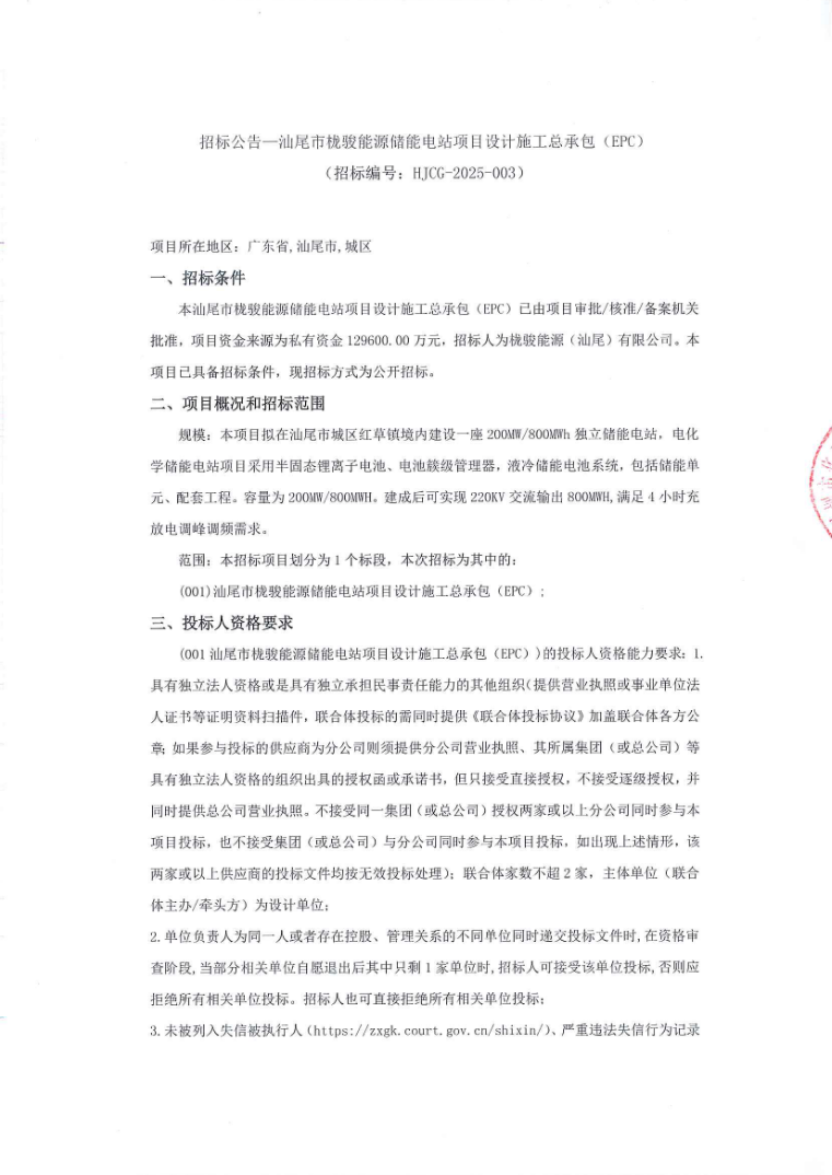 中國(guó)儲(chǔ)能網(wǎng)訊:6月18日,廣東兩項(xiàng)目?jī)?chǔ)能電站EPC招標(biāo)啟動(dòng)??傄?guī)模達(dá)400MW/1600MWh。