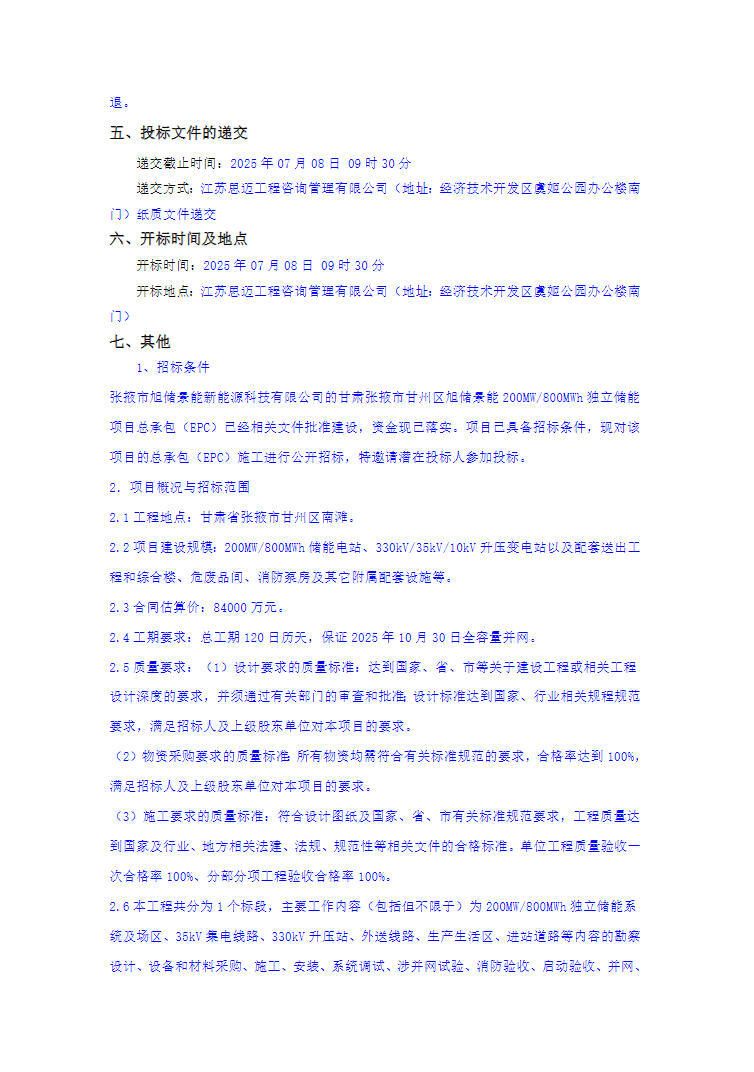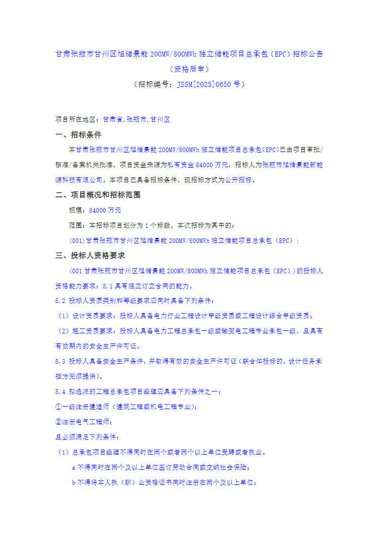 中國儲能網(wǎng)訊:6月18日,甘肅張掖市甘州區(qū)旭儲景能200MW/800MWh獨立儲能項目總承包(EPC)招標公告發(fā)布。項目資金來源為私有資金84000萬元,招標人為張掖市旭儲景能新能源科技有限公司。