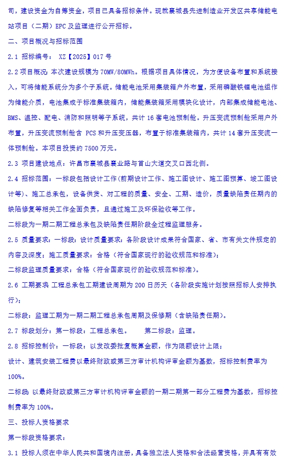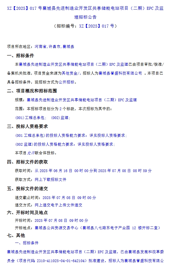 中國儲能網(wǎng)訊:6月16日,許昌市城投發(fā)展集團(tuán)旗下襄城縣譽(yù)盛科技有限公司發(fā)布襄城縣先進(jìn)制造業(yè)開發(fā)區(qū)共享儲能電站項(xiàng)目(二期)EPC及監(jiān)理招標(biāo)公告。項(xiàng)目位于河南省許昌市,本次建設(shè)規(guī)模為70MW/80MWh。儲能電池采用集裝箱戶外布置,采用磷酸鐵鋰電池組作為儲能介質(zhì),電池集成于標(biāo)準(zhǔn)集裝箱內(nèi),儲能集裝箱采用模塊化設(shè)計(jì),內(nèi)部集成儲能電池、BMS、溫控、配電、消防和照明等子系統(tǒng),共計(jì) 16 套電池預(yù)制艙。升壓變流預(yù)制艙采用戶外布置,升壓變流預(yù)制艙含 PCS 和升壓變壓器,布置于標(biāo)準(zhǔn)集裝箱內(nèi),共計(jì) 14 套升壓變流體預(yù)制艙。