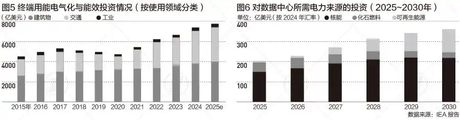 終端用能電氣化與能效投資在過去10年間近乎翻倍,2025年將達8000億美元。在交通領(lǐng)域,全球范圍內(nèi)電動汽車的銷售推動投資增長;在建筑領(lǐng)域,高效家電與制冷系統(tǒng)需求上升。工業(yè)領(lǐng)域電氣化與能效投資因政策支持與技術(shù)進步持續(xù)增長,中國、歐盟、美國為主要市場。