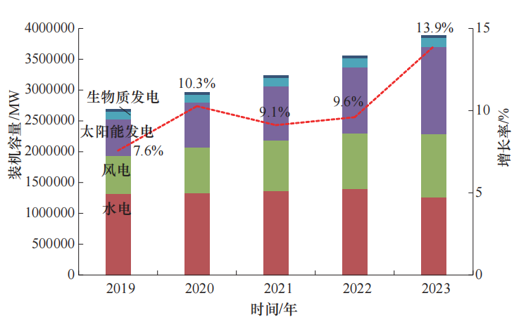 在全球氣候變化背景下,加快發(fā)展可再生能源成為全球共識。截至2023年底,全球可再生能源發(fā)電裝機(jī)容量約為3870GW,新增裝機(jī)容量約為470GW,同比增長約13.9%,占電力行業(yè)新增裝機(jī)容量的86%[2]。2019~2023年全球可再生能源發(fā)電累計(jì)裝機(jī)容量和增長率如圖1 所示。