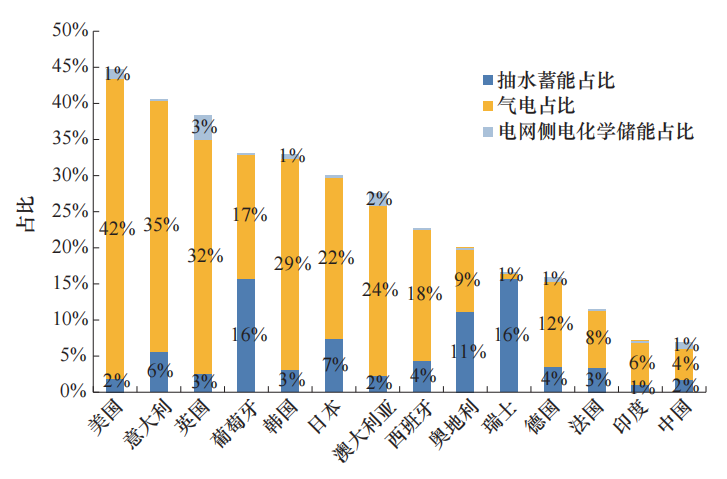 圖2 各主要國家調(diào)節(jié)電源裝機(jī)規(guī)模占電力總裝機(jī)比例