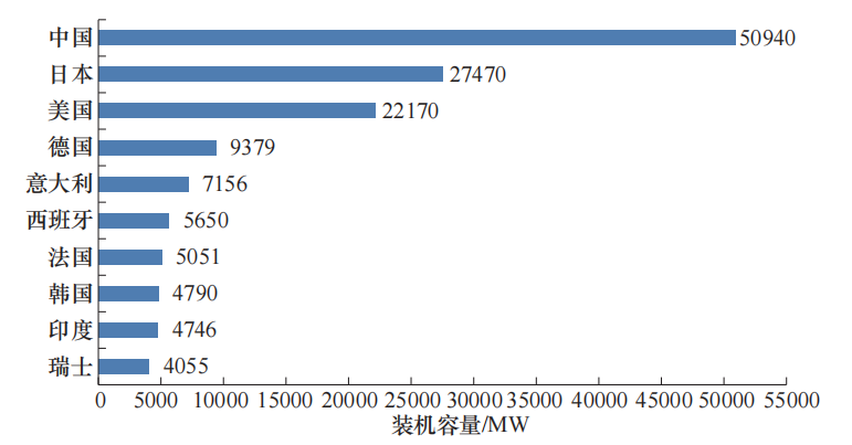 圖3 全球抽水蓄能裝機(jī)容量排名前十的國家及其裝機(jī)容量[10]